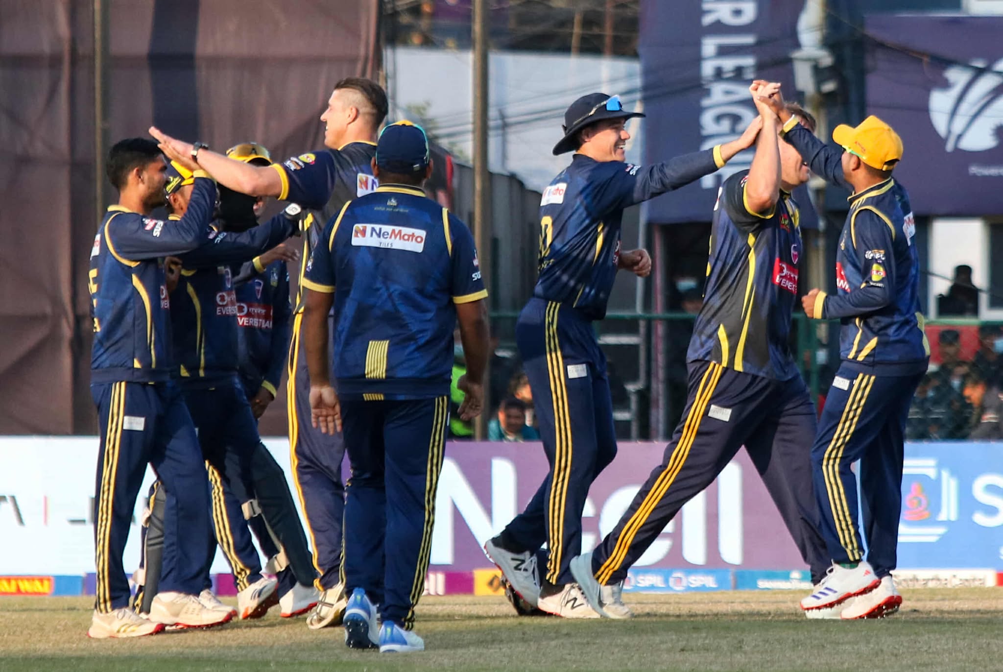 त्यसअघि टीयु क्रिकेट मैदानमा टस हारेर पहिला ब्याटिङ गरेको काठमाण्डु १९ ओभर ४ बलमा १४२ रनमा अलआउट भएको थियो । काठमाण्डुका लागि जोन सिम्पसोनले सर्वाधिक ६० रन बनाए । उनले २९ बलमा ३ चौका र ५ छक्का प्रहार गरे । जोन र मिलिन्दले चौथो विकेटका लागि ९८ रनको साझेदारी गरेका थिए । मिलिन्दले ३८ रनको योगदान दिए । वेन चाल्र्सवर्थ १३, आकाश त्रिपाठी ४, रसिद खान ६, महोम्मद आदिल आलम ८, जेरार्ड एरास्मस ०, कप्तान करण केसी १, सन्तोष यादव ० र दीपेश कँडेल ६ रनमा आउट भए । शाहव आलम २ रनमा अविजित रहे ।