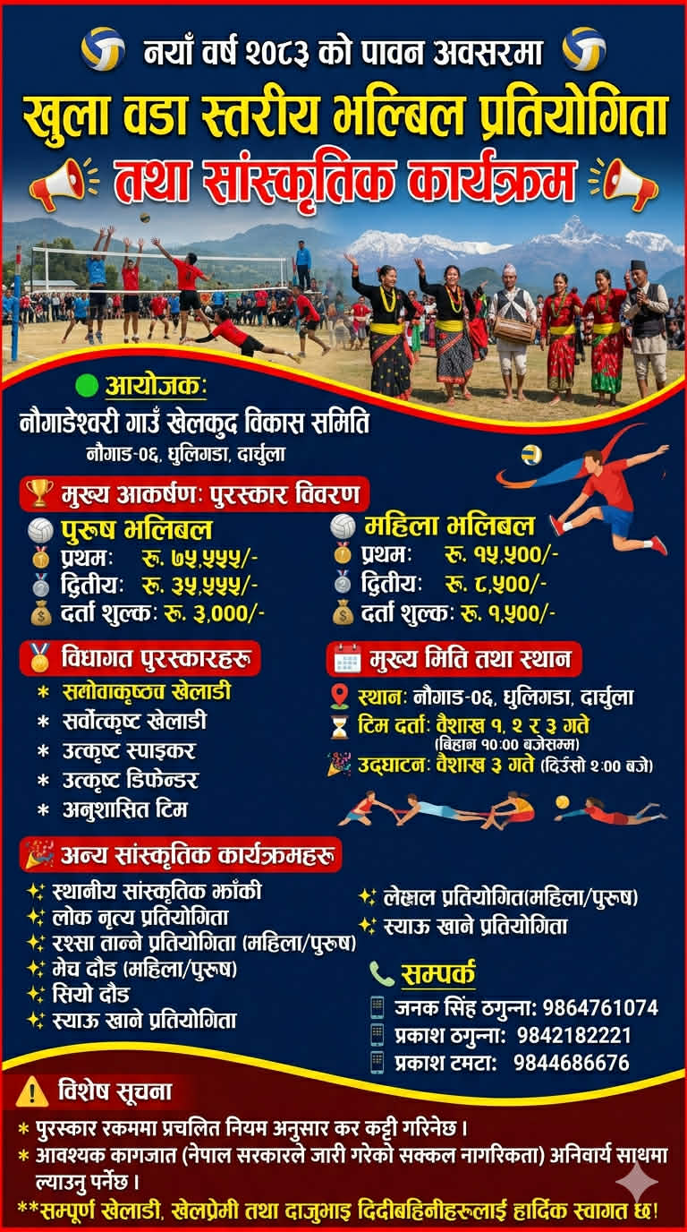 दार्चुला । नयाँ वर्ष २०८३ तथा बिसु पर्वको अवसरमा दार्चुलाको नौगाडमा खुला वडा स्तरीय भलिबल प्रतियोगिता तथा सांस्कृतिक कार्यक्रम आयोजना हुने भएको छ। नौगाड वडा नम्बर ६, धुलिगडास्थित नौगाडेश्वरी गाउँ खेलकुद विकास समितिले नयाँ वर्षको रौनकलाई थप उत्साहजनक बनाउन यो प्रतियोगिता आयोजना गर्न लागेको हो।